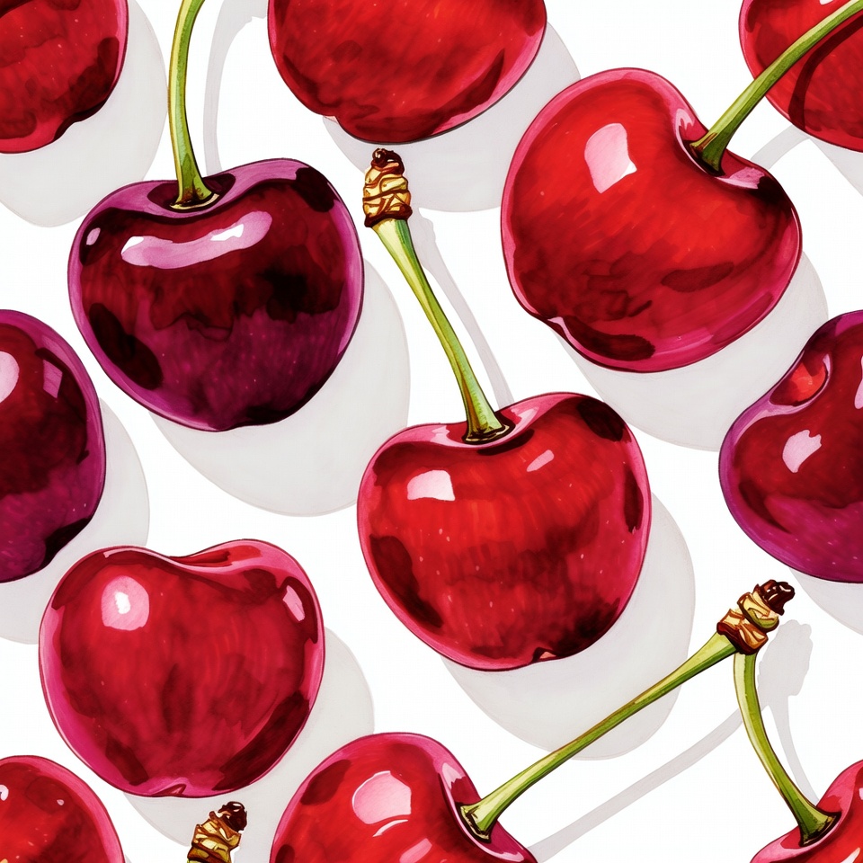 berry pattern, cherry art, cherry design, cherry illustration, cherry pattern, cherry texture, cherry wallpaper, fruit background, fruit illustration, fruit pattern, glossy cherries, green stems, red cherries, red fruit, repeating cherries, ripe cherries, seamless pattern, vector cherries, white background, cherries