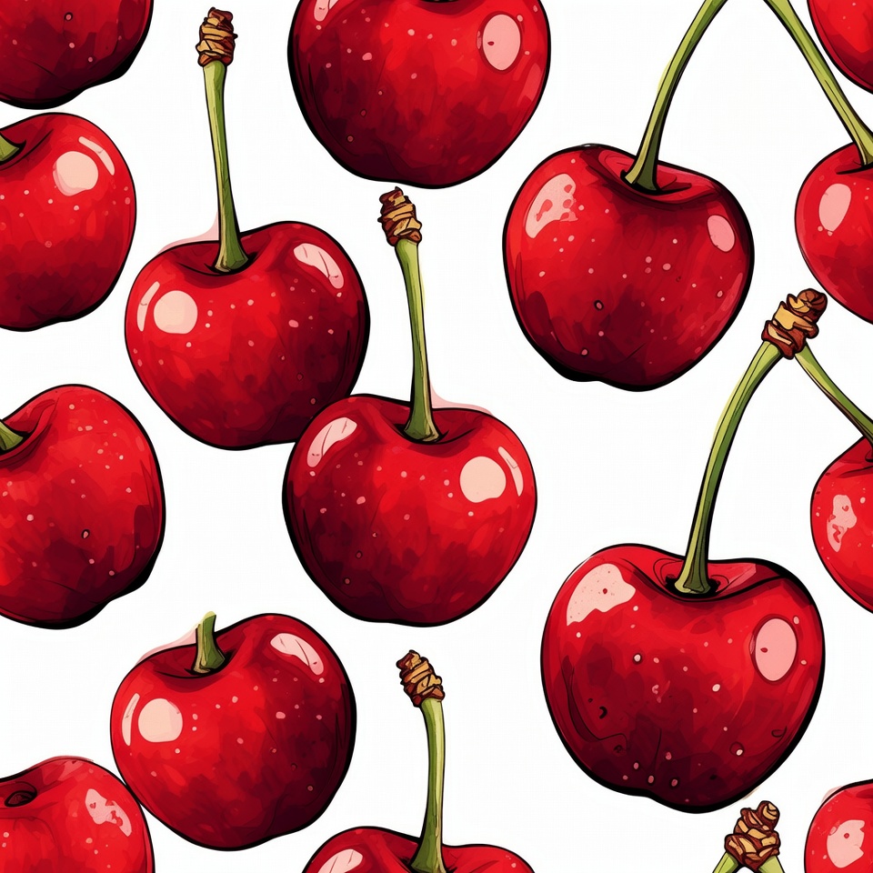 cherry design, cherry illustration, cherry pattern, cherry wallpaper, clipart, fruit, fruit pattern, glossy cherries, green stems, illustration, isolated background, red cherries, red fruit, repeating cherries, seamless pattern, white background, cherries