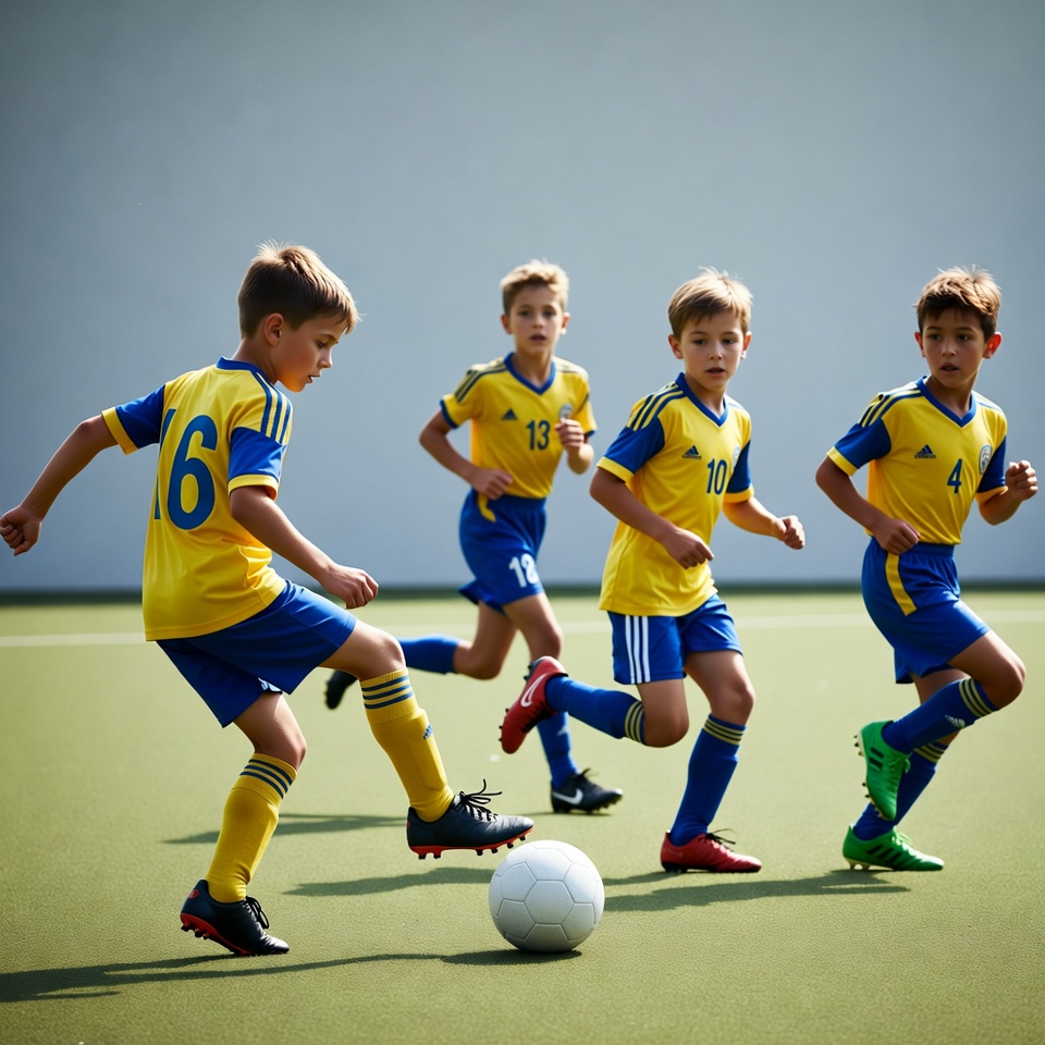 Four young boys with light brown hair wear yellow and blue soccer jerseys with numbers 4, 10, 13, and 16 while playing on a green field. One boy in jersey 16 kicks a white soccer ball, with the others running nearby. They have focused expressions and wear matching shorts, socks, and cleats.