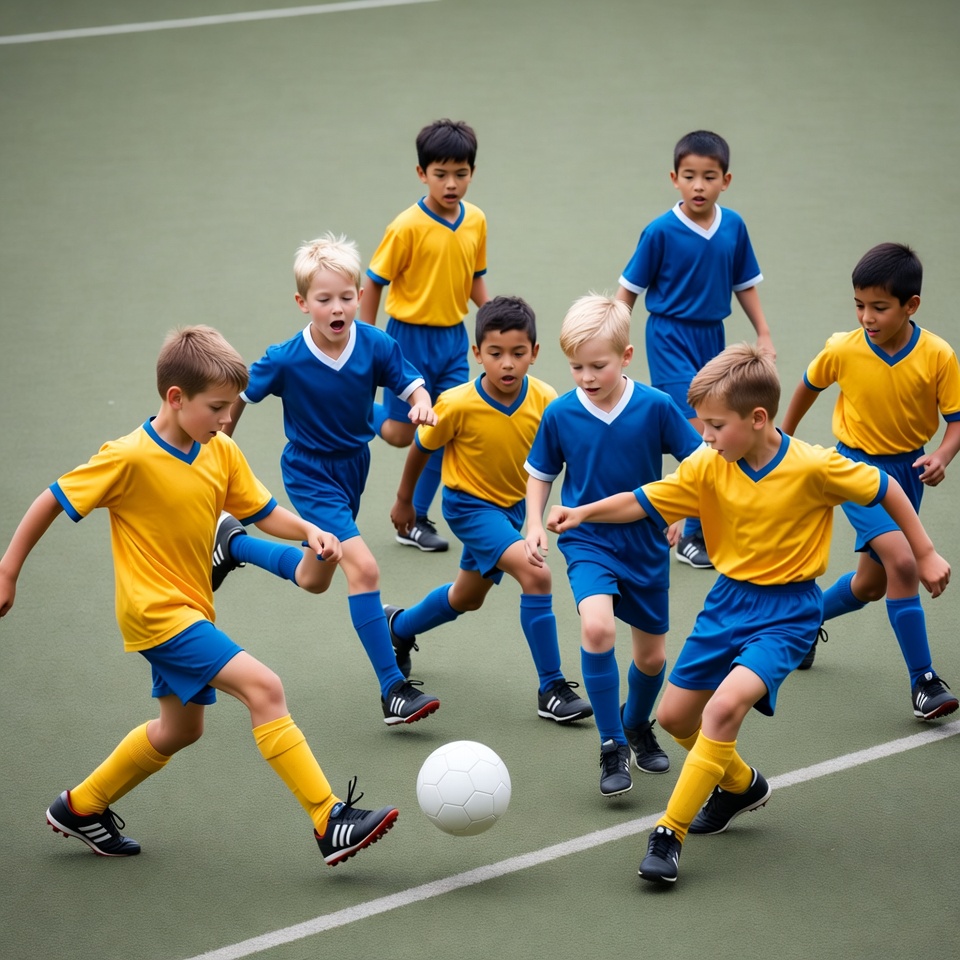 Asian, action, athletic, blue jerseys, children, field, football, grass field, group, kicking ball, kids, match, outdoor, playing, running, soccer, sports, team, uniforms, white ball, yellow jerseys, young boys, youth soccer, boys