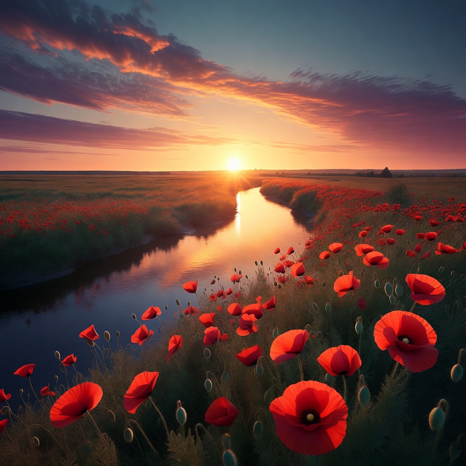 A vibrant red poppy field lines both sides of a winding river during a dramatic sunset. The golden sun hangs low over the horizon, casting warm orange and pink hues across the expansive landscape. Gentle green grasses and scattered poppy buds frame the serene waterway.
