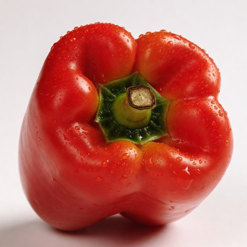 bell pepper, capsicum, dew drops, food, fresh vegetable, green stem, isolated, produce, red pepper, shiny surface, top view, vegetable, water droplets, white background, red bell pepper