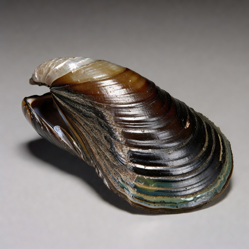 A single mussel shell lies open on a neutral background, displaying its iridescent interior with shades of brown, purple, and green. The exterior is darker with textured ridges, and the shell is slightly ajar. Fine details highlight the nacreous sheen and natural patterns.