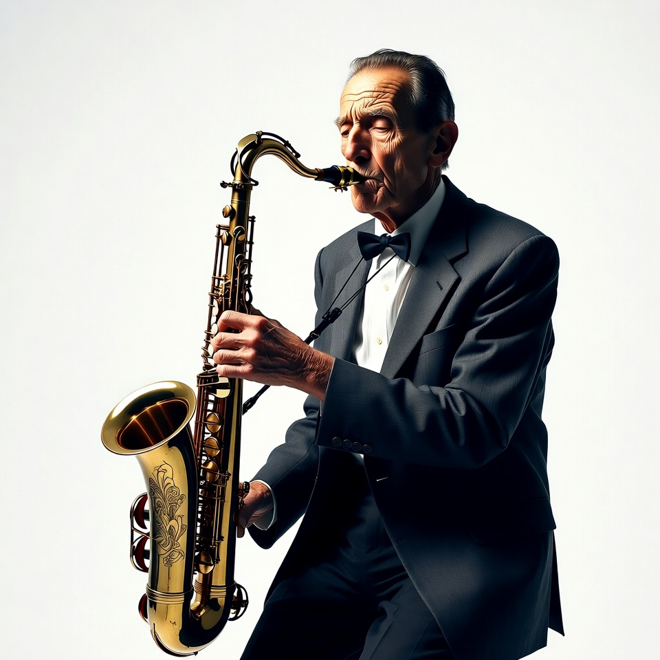 An elderly man with wrinkled skin plays a shiny golden saxophone. He wears a black tuxedo with a white shirt and black bow tie. The image is a silhouette against a white background.