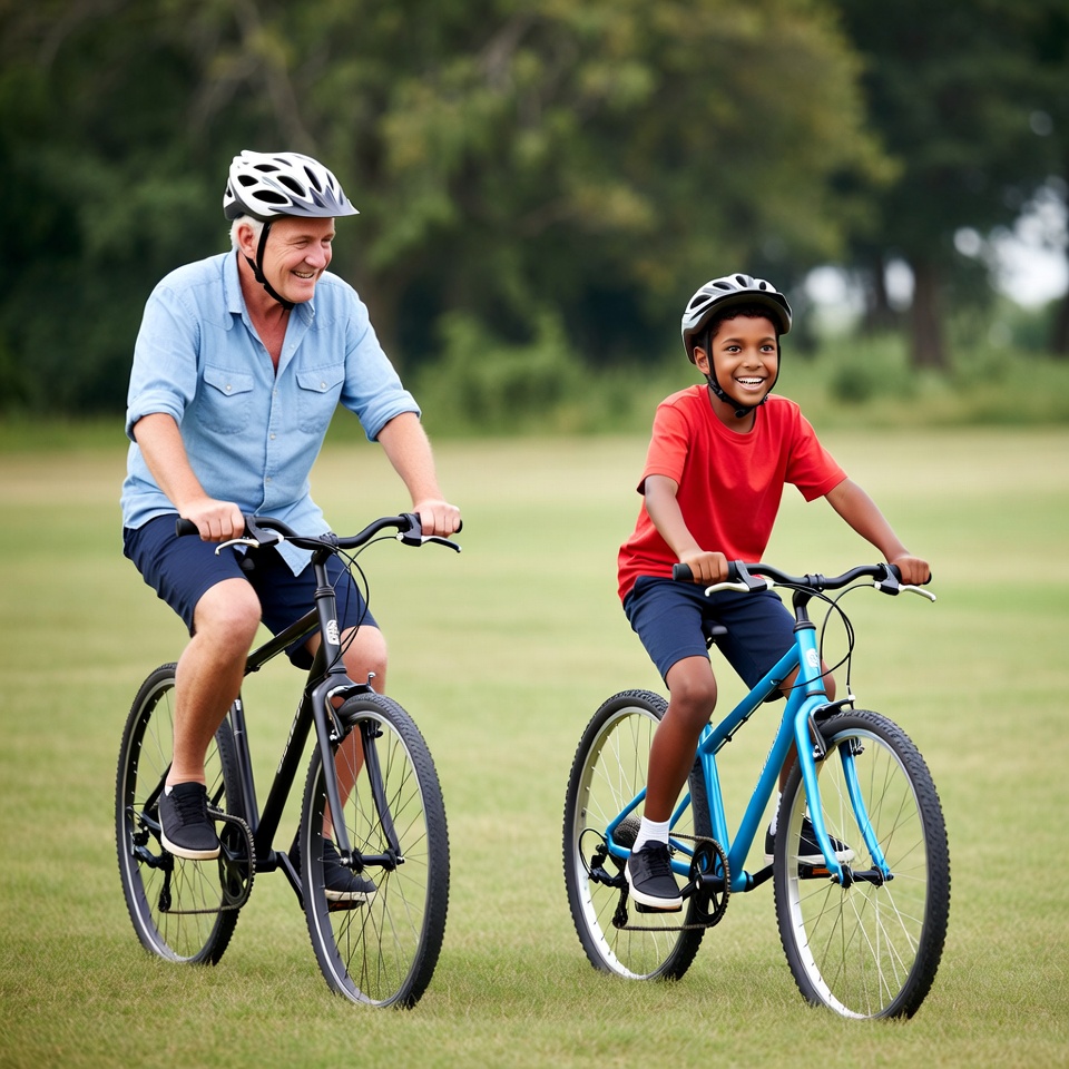 A White father wearing a light blue shirt, navy shorts, and helmet rides a black mountain bike on green grass. Beside him, his smiling African-American son in a red t-shirt, navy shorts, and helmet pedals a blue children's bike. They bike together outdoors with trees in the background.