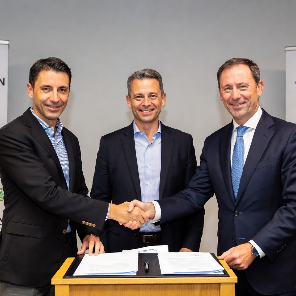 Three middle-aged men in dark suits and light blue shirts stand at a wooden podium, shaking hands over signed documents. They smile professionally with banners in the background. One man has dark hair, another graying hair, and the third light brown hair.