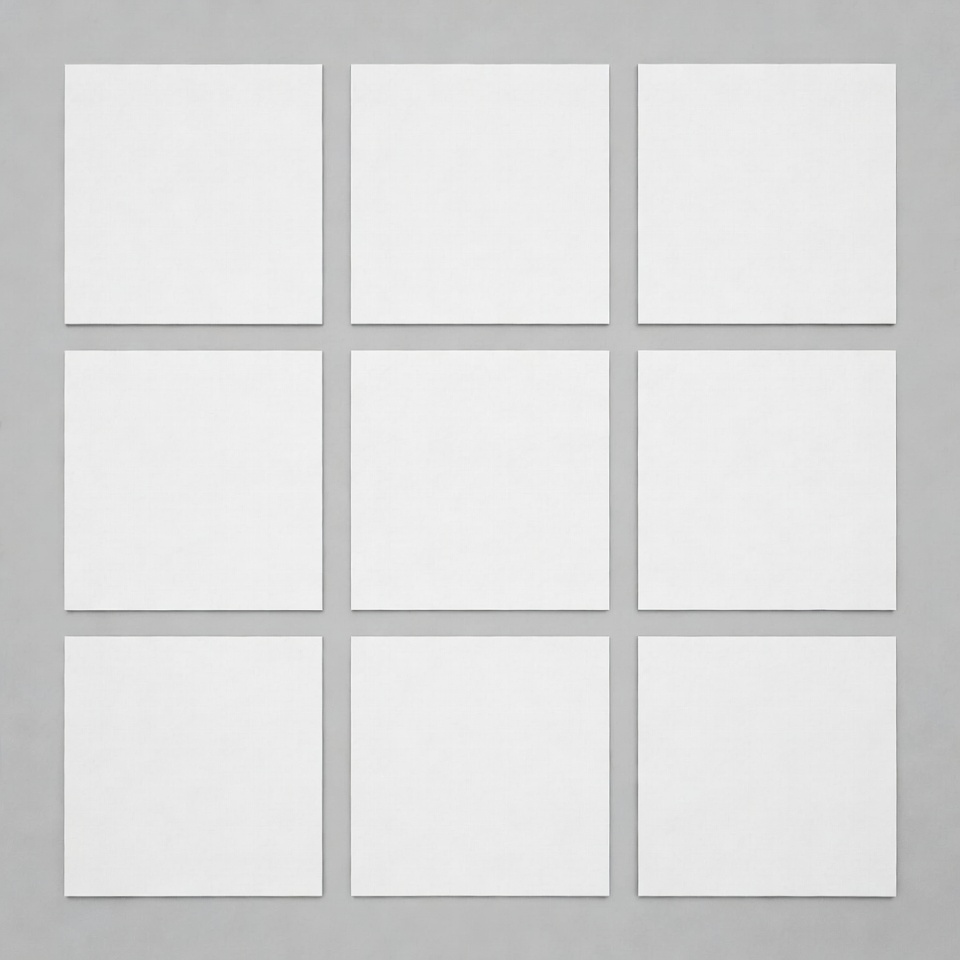 Nine identical white squares are arranged in a 3x3 grid. They are centered on a solid light gray background. The squares have clean, sharp edges with subtle shadows.