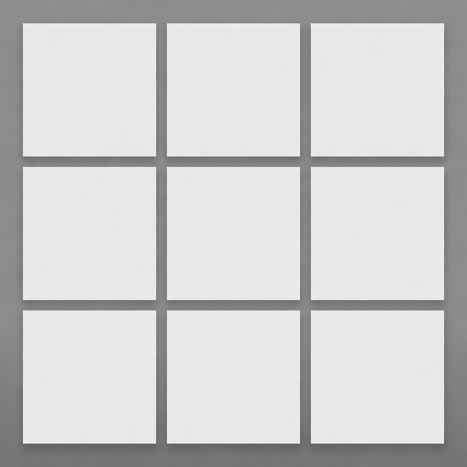 A grid layout features nine identical blank white squares arranged in three rows and three columns. The squares are evenly spaced on a light gray background. Each square has a clean, empty surface with subtle shadows.