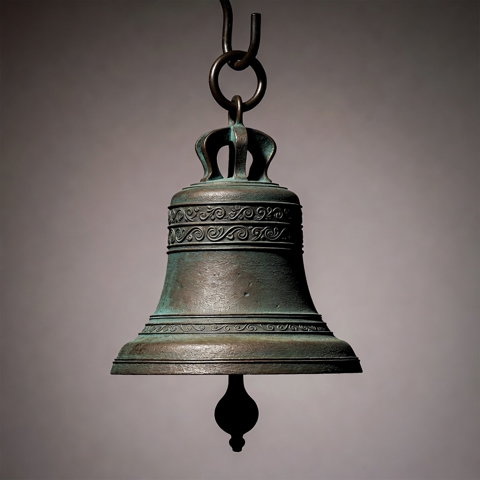 antique bell, bell closeup, chain suspension, church bell, clapper, engraved bell, hanging bell, isolated background, large bell, metal bell, scroll design, vintage bell, bronze bell