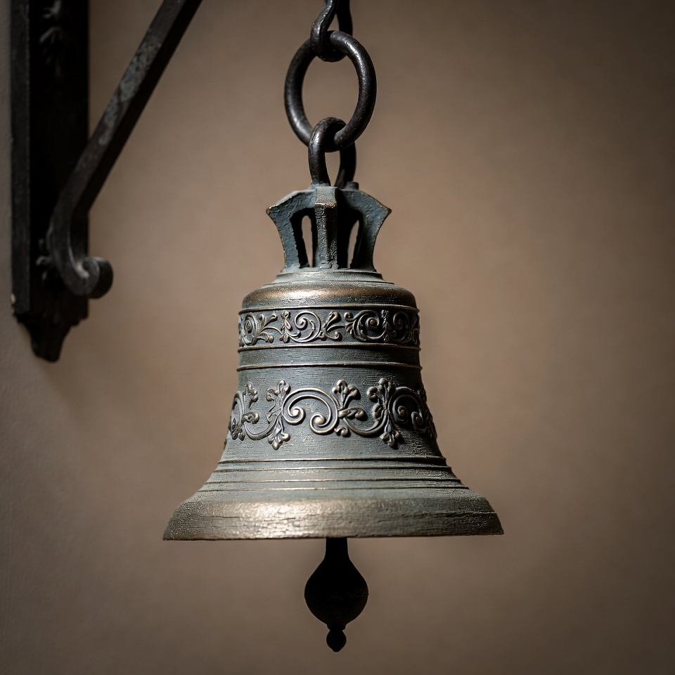 A large bronze bell with intricate floral engravings hangs from a thick chain attached to an ornate metal bracket. The bell features a detailed clapper and curved designs on its surface. It is suspended against a neutral blurred background.