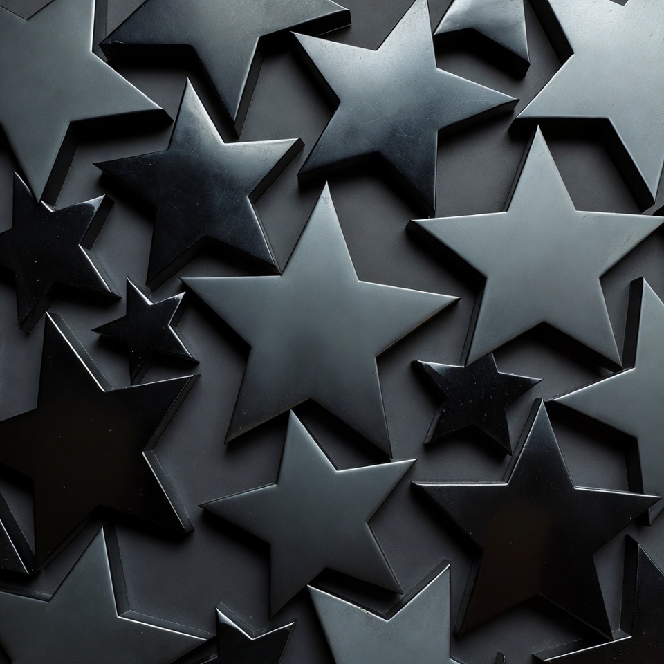 Numerous glossy black five-pointed stars are scattered across a dark gray surface. The stars vary slightly in size and overlap each other, creating a dense pattern. The metallic sheen on the stars catches the light, adding depth to the composition.