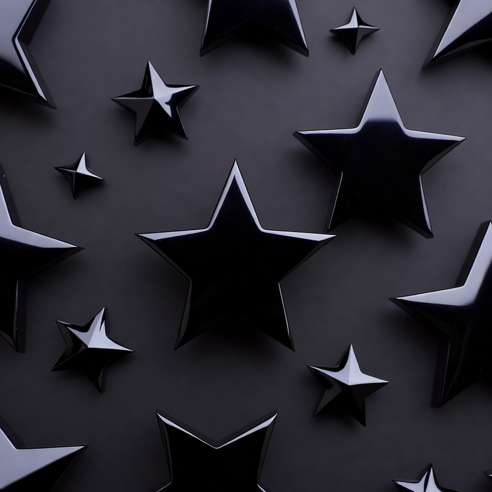 Multiple black glossy stars of varying sizes are scattered across a dark gray background. The stars have a shiny, reflective surface and three-dimensional appearance. They are arranged in a random pattern with ample negative space.
