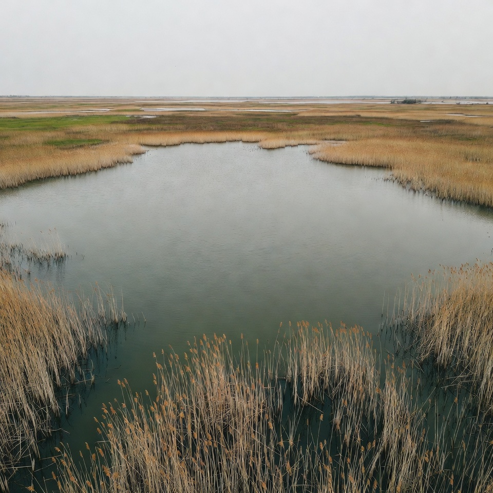 A serene lake is encircled by tall golden reeds in a vast marshy landscape. The water appears calm and reflective, surrounded by patches of green and brown wetland vegetation. The scene is captured from an elevated angle under overcast skies.