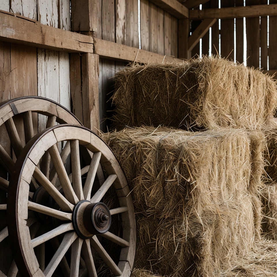 Hay Bales and Wagon Wheel in Barn