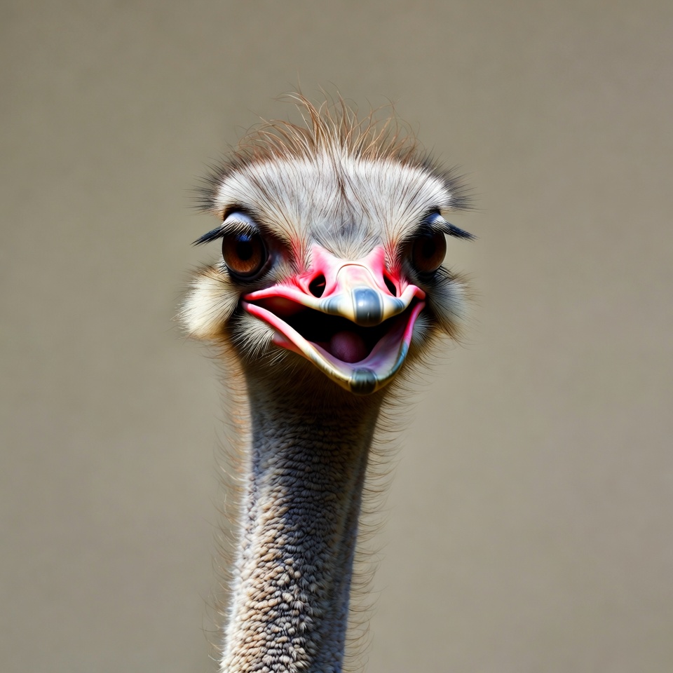 A large ostrich with fluffy brown and white feathers stares directly at the camera against a plain beige background. Its large expressive eyes are wide open, and its beak is parted in a smiling expression revealing a yellow tongue. The neck feathers are detailed and ruffled.