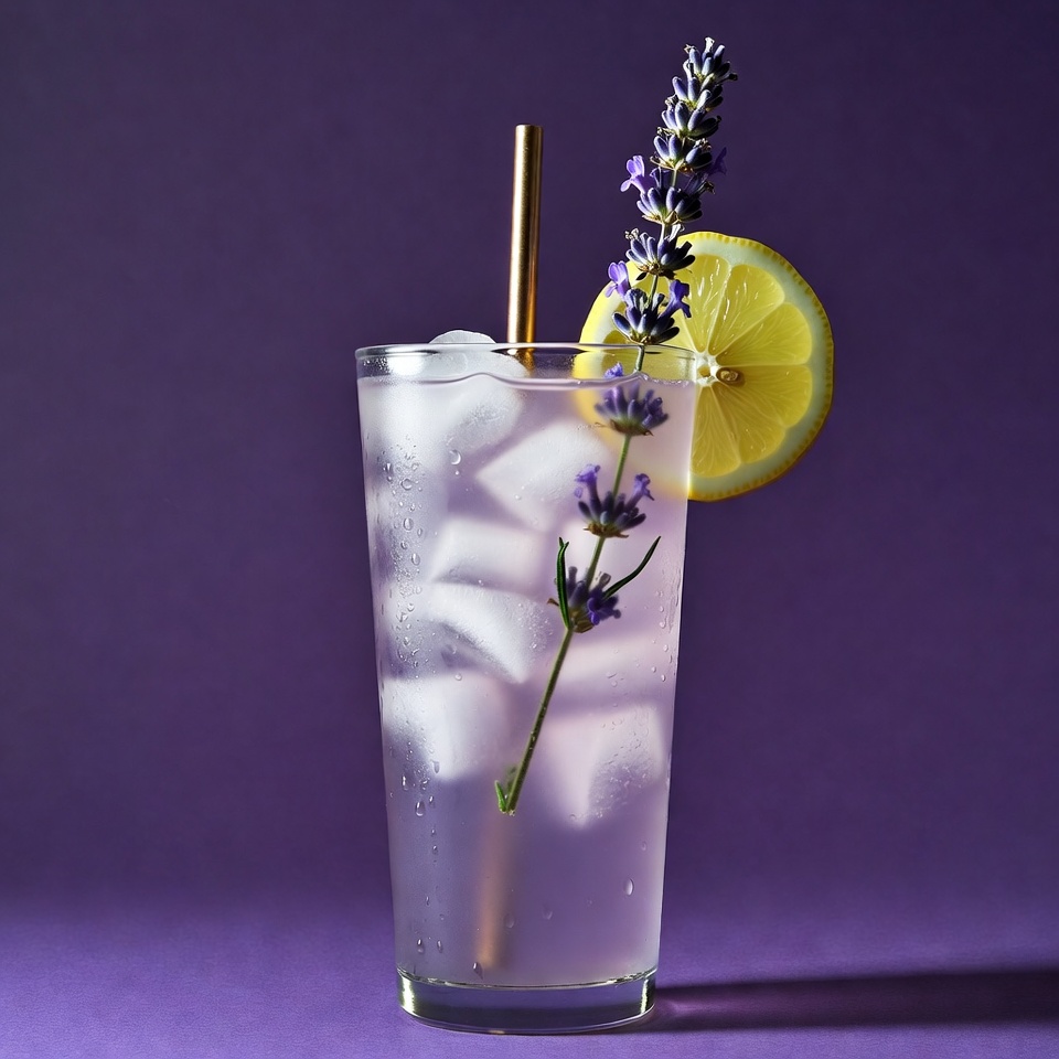 beverage, clear liquid, cocktail, garnish, glass, gold straw, ice cubes, iced drink, lavender sprig, lemon slice, lemonade, purple background, refreshing drink, summer drink, tall glass, lavender lemonade