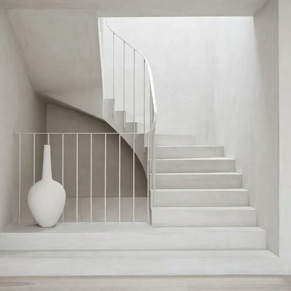 A modern white spiral staircase features slim metal railings and concrete steps in a minimalist interior. A large white vase sits at the base beside the stairs. The scene is set against plain white walls with soft natural light.