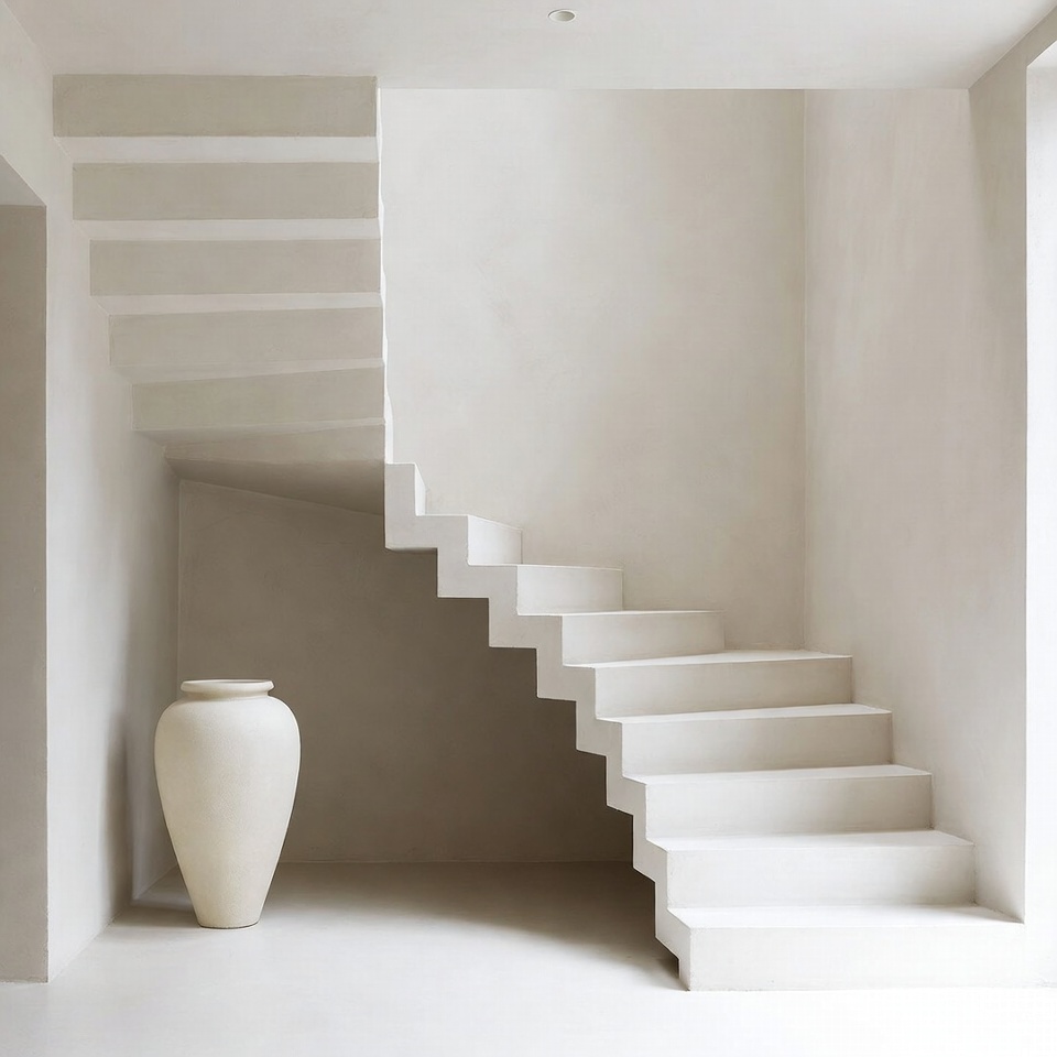 angular steps, architecture, beige vase, clay pot, design, empty room, home interior, interior stairs, isolated background, minimalist architecture, modern stairs, spiral stairs, terracotta vase, white room, white staircase