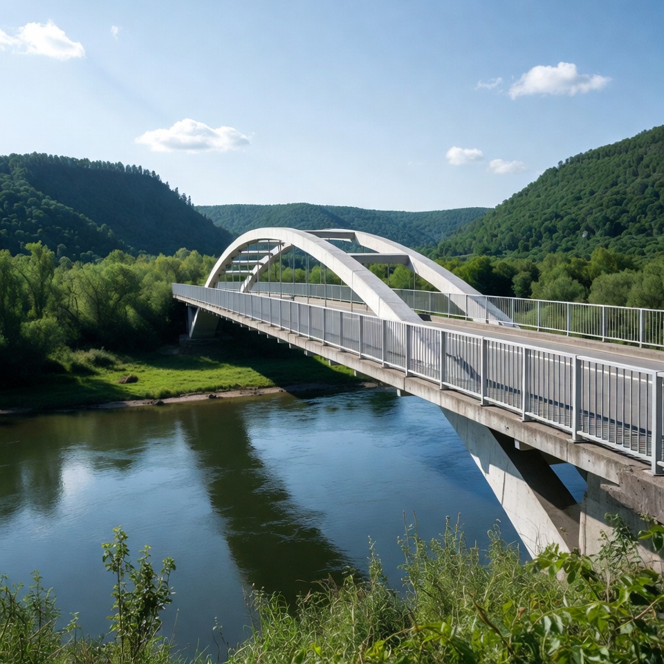 A modern white arch bridge spans a calm river surrounded by lush green hills and forests. The structure features sleek concrete arches and metal railings under a clear blue sky with scattered clouds. Vegetation lines the riverbanks and hills in the background.