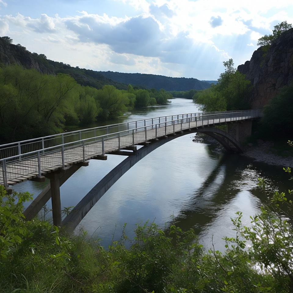 A modern arched pedestrian bridge with wooden decking spans a calm river in a lush green canyon. Sunlight filters through scattered clouds, casting reflections on the water below. Dense green vegetation and rocky cliffs surround the serene riverside scene.
