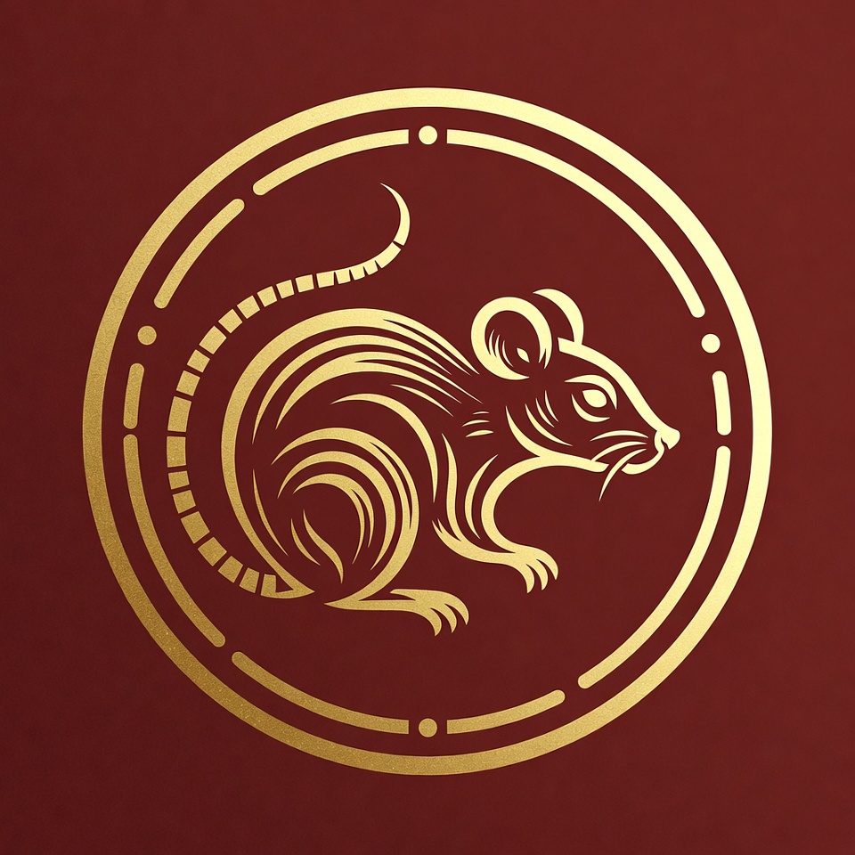 animal, chinese zodiac, circle, clipart, festive, gold outline, golden rat, illustration, isolated background, line art, ornate rat, red background, rodent, year of the rat, zodiac sign, rat