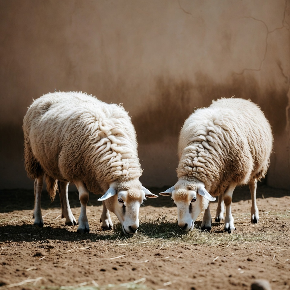 animal pair, barnyard, beige wall, curled horns, dirt ground, eating hay, farm animals, fluffy sheep, green hay, isolated background, livestock, outdoors, sheep eating, sunny day, two sheep, white sheep, sheep