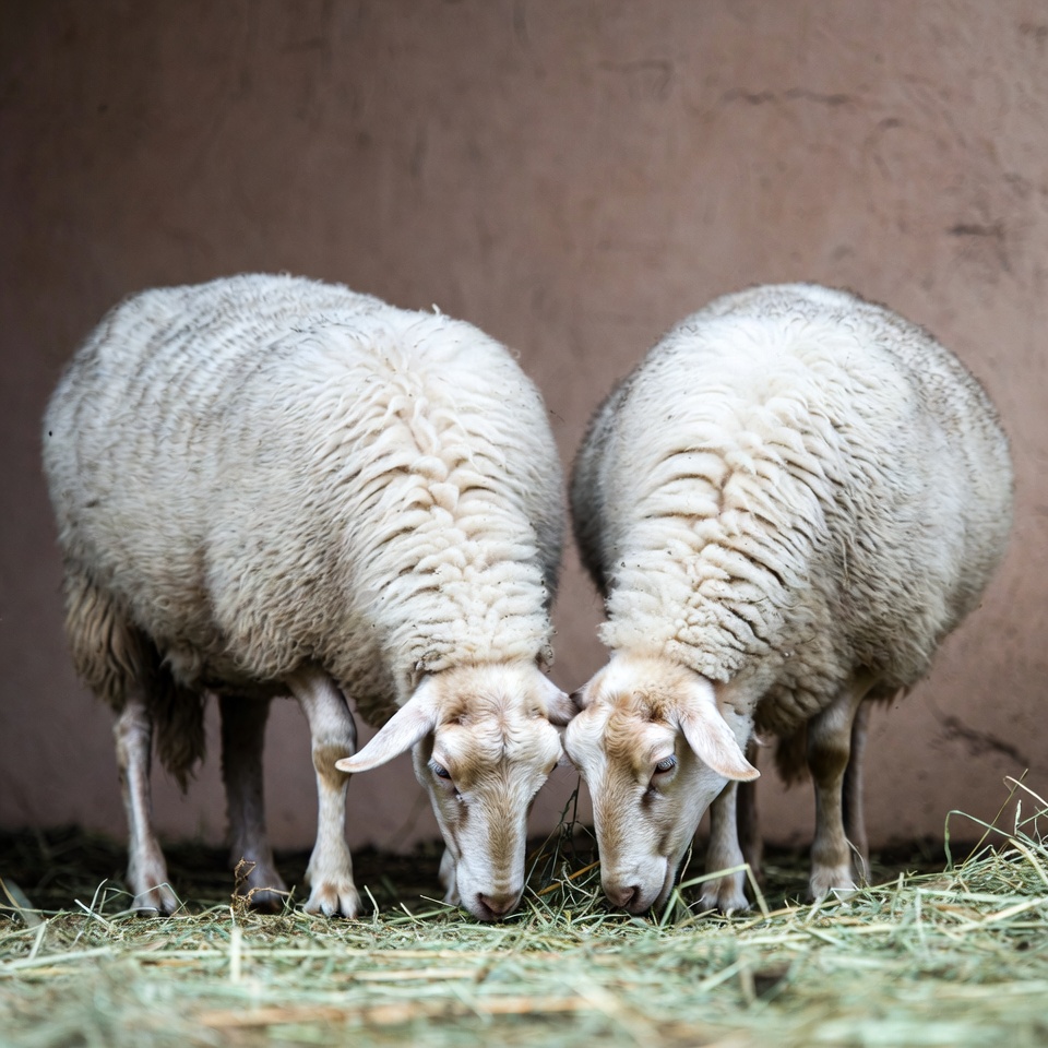 animal pair, animals, barn wall, curled horns, cute sheep, eating hay, farm animals, fluffy sheep, hay, isolated background, livestock, sheep duo, sheep eating, two sheep, white sheep, sheep