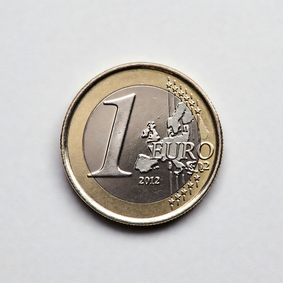 A close-up view of a gold and silver 1 Euro coin from 2012. The coin features the large numeral '1' and 'EURO' text on the silver center with the European Union map outline and stars on the gold rim. It is placed on a plain white background.