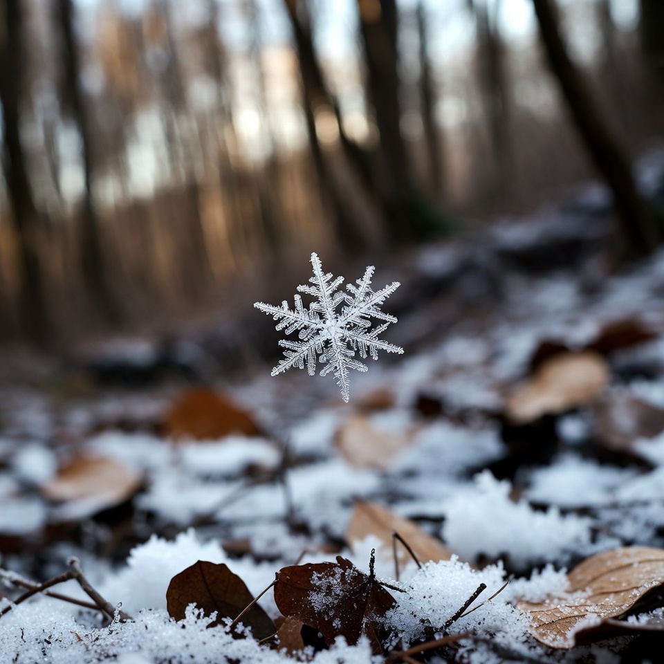 autumn leaves, bare trees, bokeh background, closeup, crystal, detailed snowflake, forest, forest floor, frozen, ice crystal, leaves, macro, nature, outdoor, snow, snow-covered, trees, white snowflake, winter, snowflake