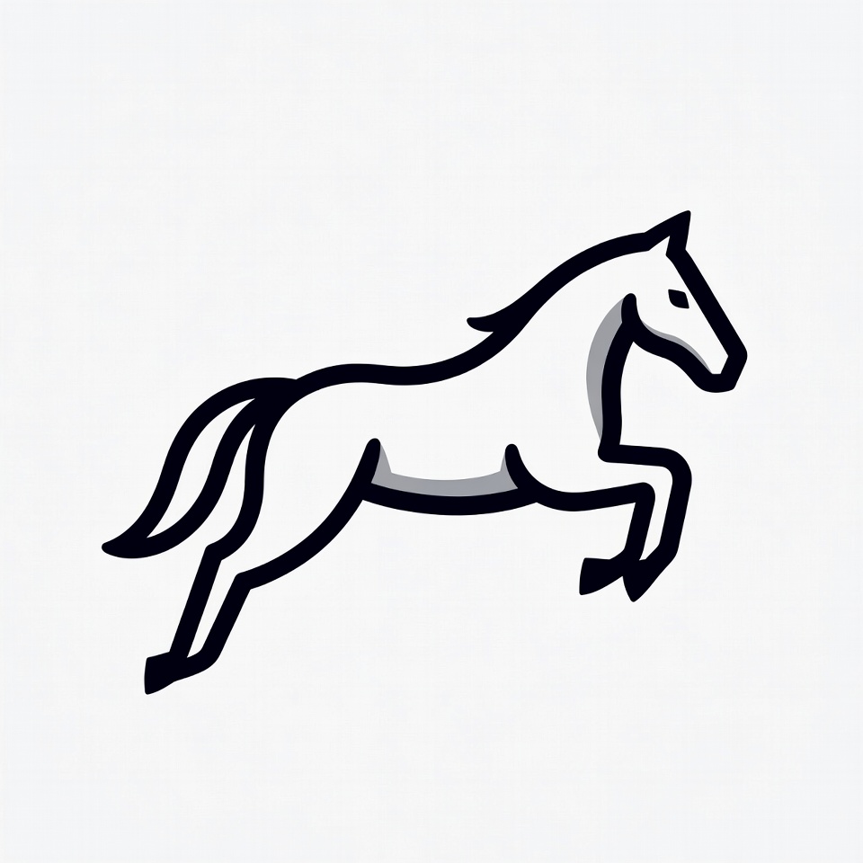 A minimalist line art illustration of a horse in mid-jump. The horse has a flowing mane and tail, with legs extended dynamically. It features a clean black outline on a white isolated background.