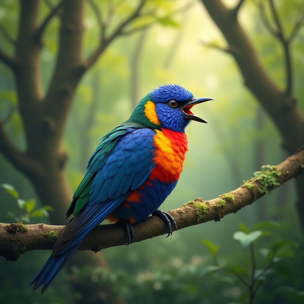 A vibrant bird with blue, green, yellow, and red feathers perches on a mossy branch in a lush green forest. It has its beak wide open as if singing, surrounded by soft sunlight filtering through the trees. The background features dense foliage and a dreamy, bokeh effect.