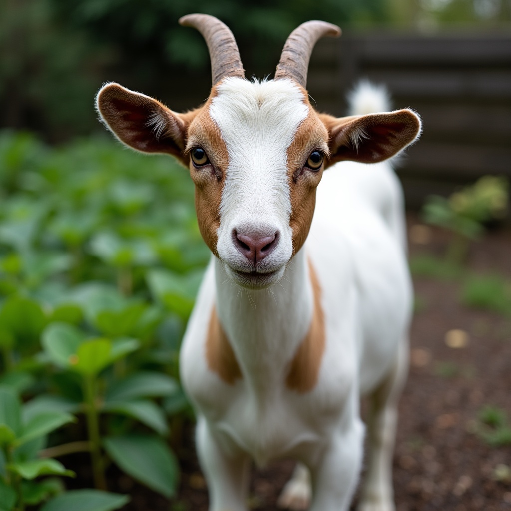 A young goat with brown and white fur and curved horns stands in a garden. It has large expressive eyes and floppy ears, facing the camera directly. Green plants and a wooden fence are visible in the background.