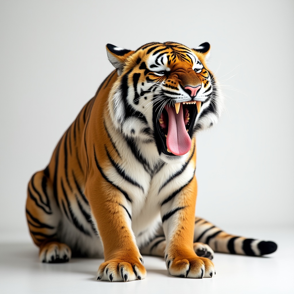 A tiger sits on a white background with its mouth wide open in a roar, exposing sharp teeth and a pink tongue. Its orange fur features bold black stripes, and its ears are perked up. The tiger's front paws are visible, and it leans forward aggressively.