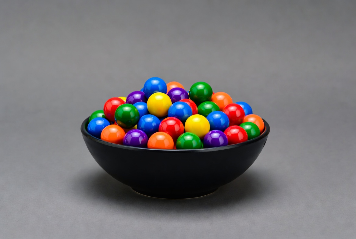 black bowl, blue marbles, bowl, colorful marbles, glass marbles, gray background, green marbles, multicolored, orange marbles, pile, purple marbles, red marbles, round marbles, shiny marbles, toy marbles, vibrant colors, yellow marbles, marbles