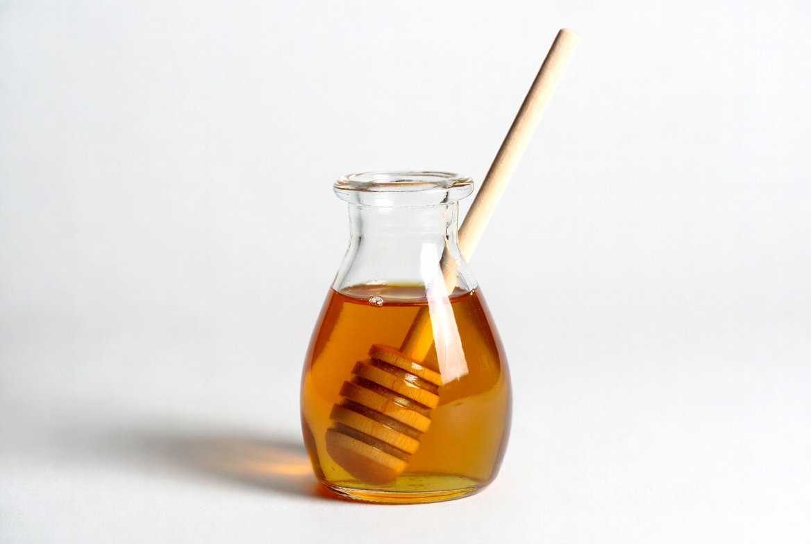 A clear glass jar filled with golden honey sits on a white background. A wooden honey dipper with honey-coated coils is inserted into the jar. The honey drips slightly from the dipper.