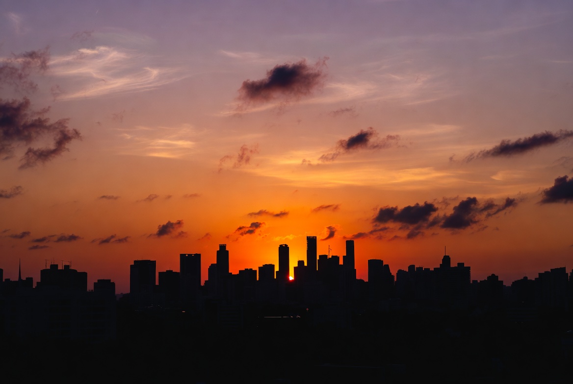 buildings, cityscape, clouds, dusk, horizon, orange sky, purple clouds, silhouette, sky, skyscrapers, sun, sunset, twilight, urban landscape, city skyline