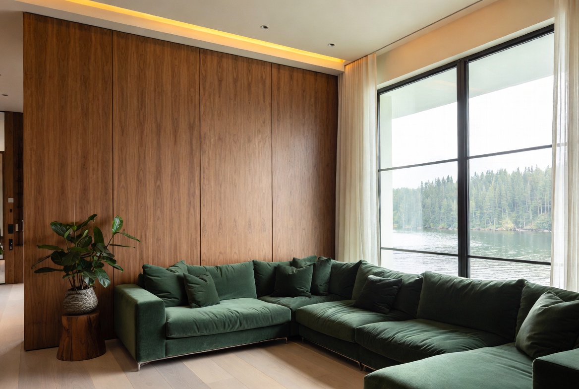 L-shaped sofa, LED lighting, contemporary design, cozy seating, emerald green, forest view, furniture, home decor, indoor plant, lake view, large windows, luxury living room, modern interior, nature view, potted plant, recessed lights, sectional sofa, sheer curtains, side table, velvet sofa, wall panels, window seat, wooden floor, wooden wall, green sofa
