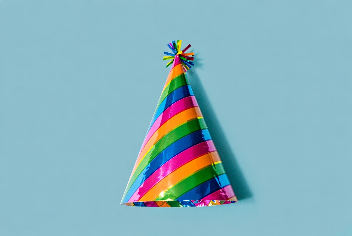 birthday hat, celebration hat, clipart, colorful hat, cone hat, festive hat, illustration, isolated background, light blue background, multicolored stripes, pom pom, rainbow hat, tassels, party hat