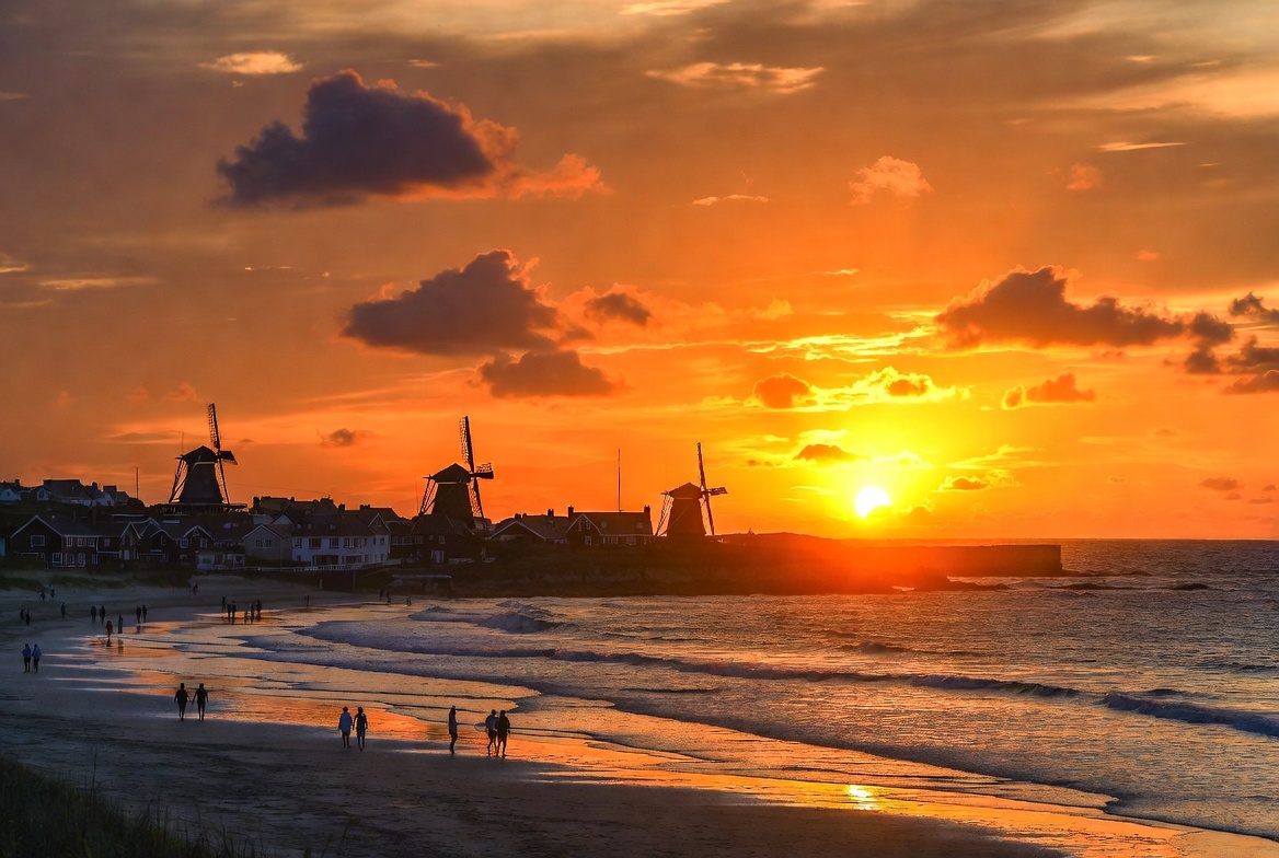 Dutch windmills, beach, clouds, houses, ocean, orange sky, people, sand, sea, shore, silhouettes, sunset, village, walking, waves, windmills