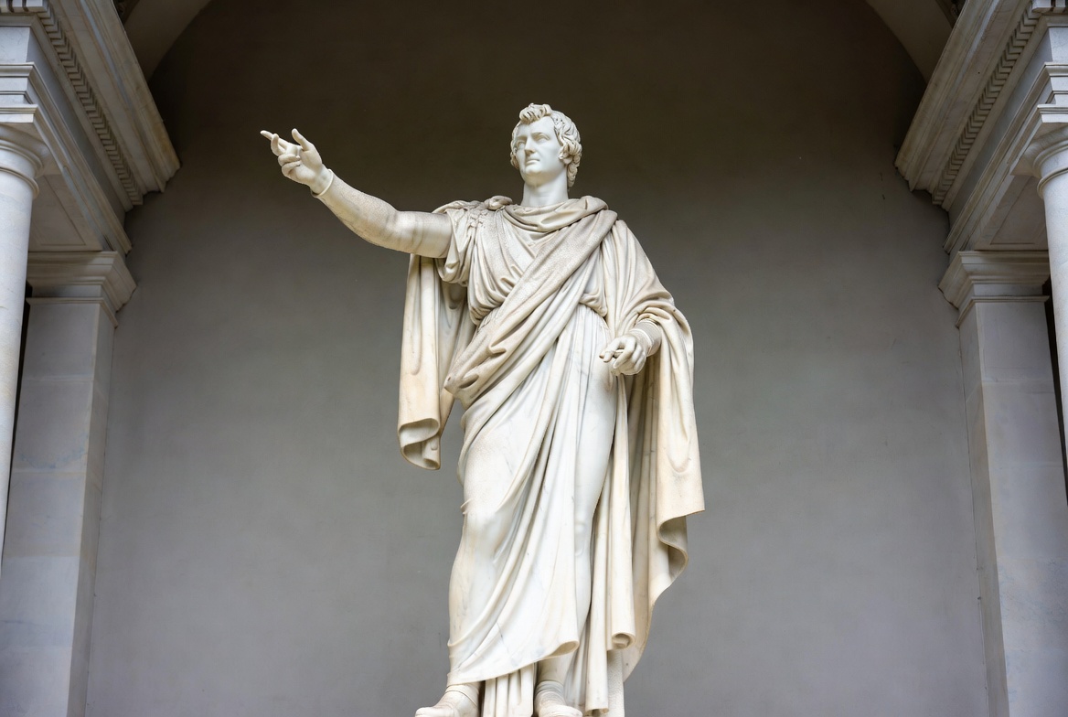 Greco-Roman, Roman statue, White, ancient Rome, architecture, classical statue, curly hair, draped clothing, historical figure, male, man, museum statue, pointing gesture, raised arm, sculpture, standing pose, stone columns, toga, white marble, marble statue