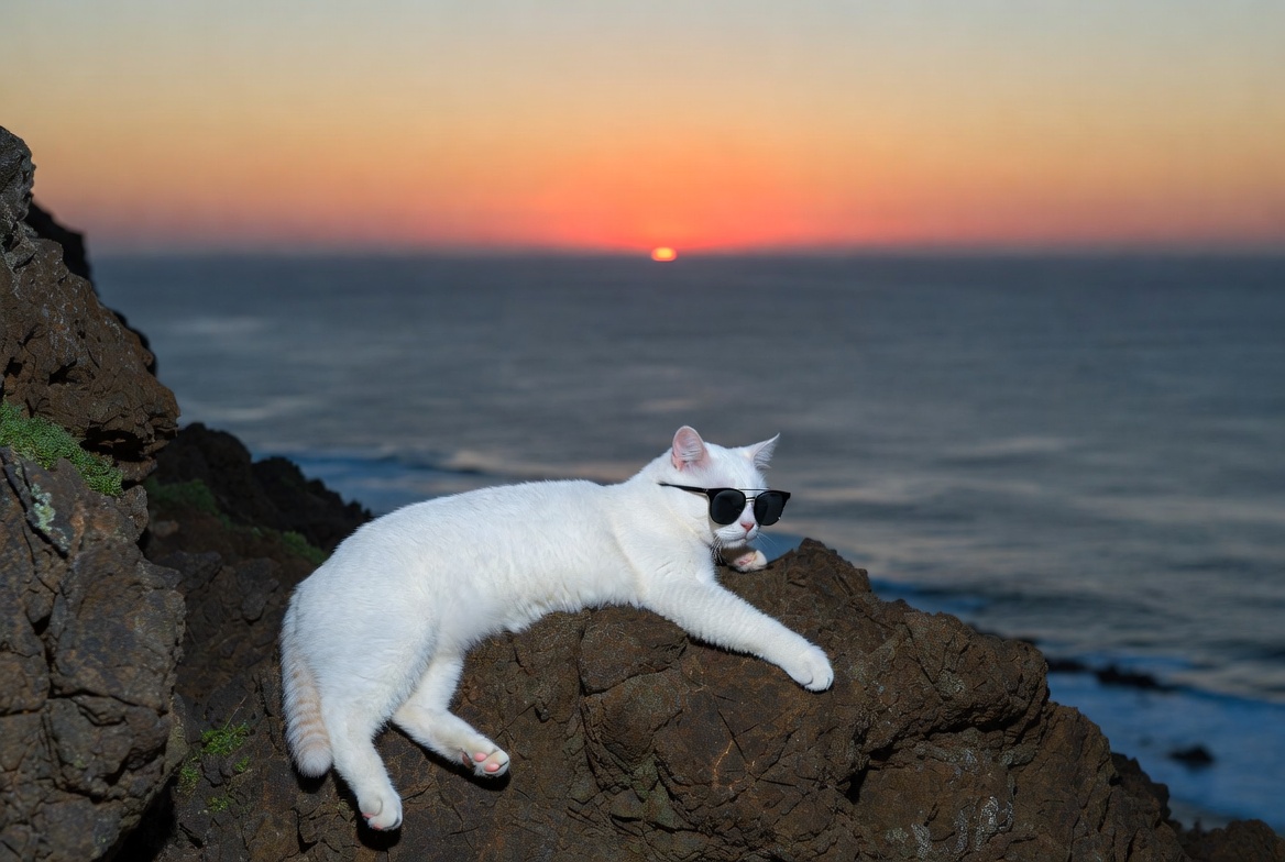 animal, beach cliff, cat, cliff, cool cat, feline, golden hour, horizon, lounging cat, ocean, orange sky, pink sky, relaxed cat, rocks, sea, sky, sunglasses, sunset, white cat