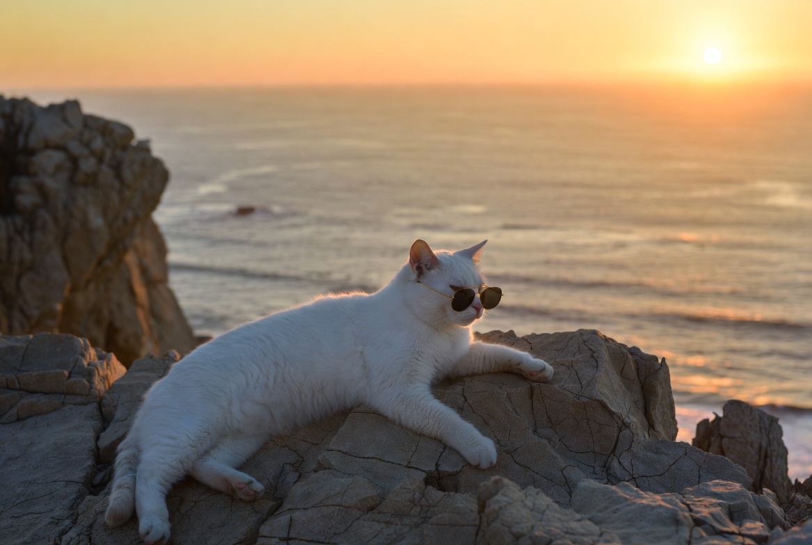 animal, beach cliff, cat, cliff, cool cat, feline, golden hour, horizon, isolated background, kitty, lounging cat, ocean, pet, relaxed cat, rocks, sea, sunglasses, sunset, waves, white cat