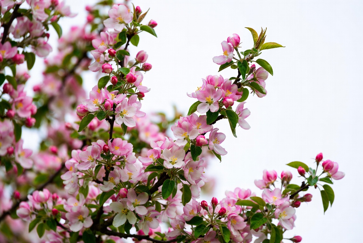 bloom, blossoms, branch, cherry tree, floral, flower buds, flowering branch, fresh flowers, green leaves, isolated, macro flowers, nature, petals, pink flowers, pink petals, spring flowers, tree branch, white background, yellow centers, cherry blossoms