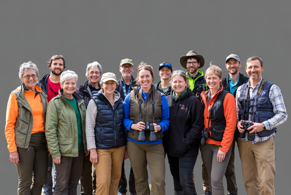 A large diverse group of men and women stands together on a gray background, dressed in outdoor hiking gear and colorful jackets. Several hold binoculars around their necks or in hands, and some wear wide-brimmed hats. They pose closely as a team, ready for birdwatching.