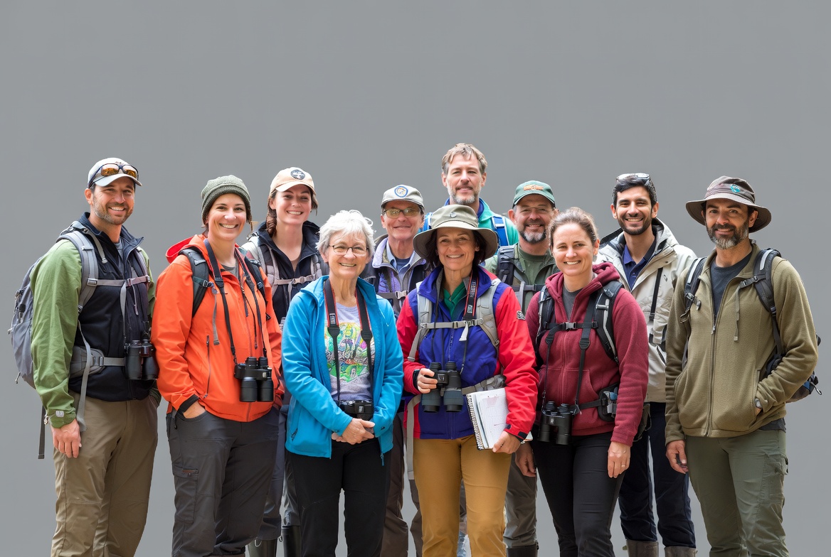Asian, Latino, Middle Eastern, White, adventure, backpacks, binoculars, diverse, excursion, field trip, gray background, group, hats, hiking gear, men, multiracial, nature lovers, outdoors, smiling, standing, team, wildlife watching, women, birdwatchers