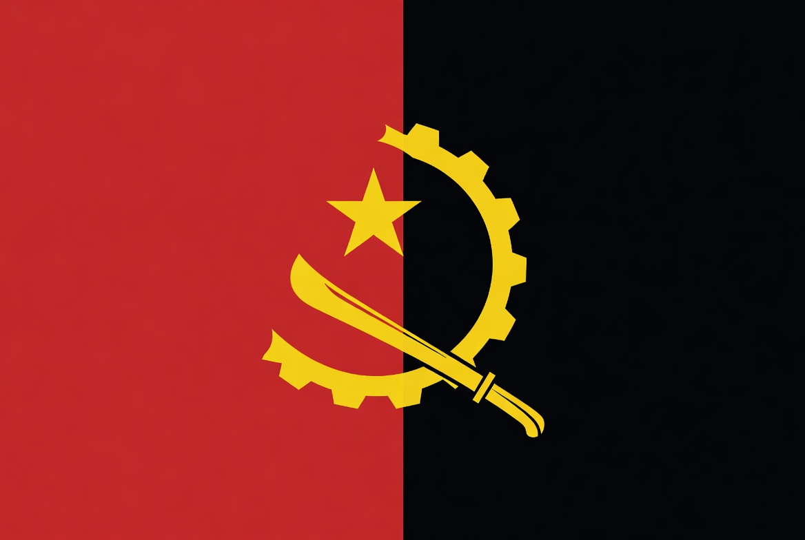 The flag of Angola features a red field on the left half and a black field on the right half. In the center is a yellow five-pointed star within a yellow cogwheel, with a machete positioned diagonally across it. The design is bold and symbolic, set against an isolated background.