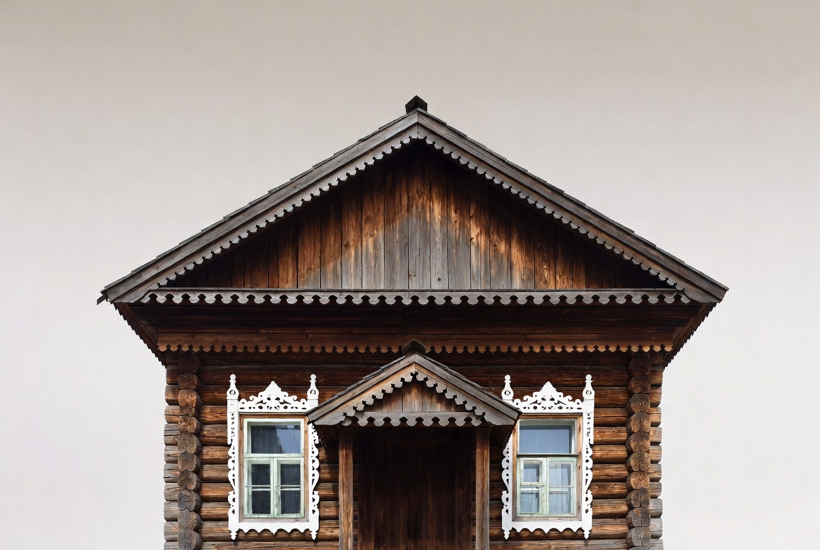 architecture, building, carved wood, cottage, facade, gabled roof, isolated background, log cabin, logs, rustic house, timber house, traditional architecture, white trim, window frames, wooden door, wooden house