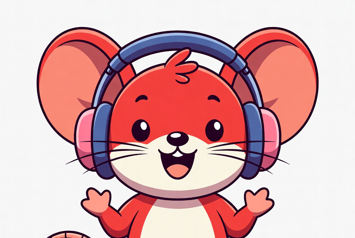 A cartoon red mouse with large ears and big sparkling eyes wears blue headphones. It has a wide happy smile, white belly, and pink inner ears. The mouse stands with paws raised on an isolated white background.