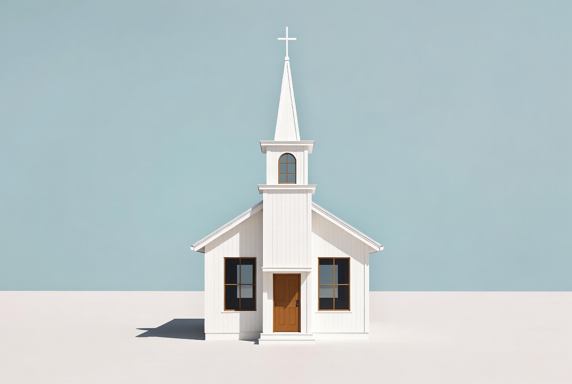 3D render, architecture, blue background, building, chapel, christian church, church, cross, door, isolated background, religious building, roof, small church, steeple, windows, white church