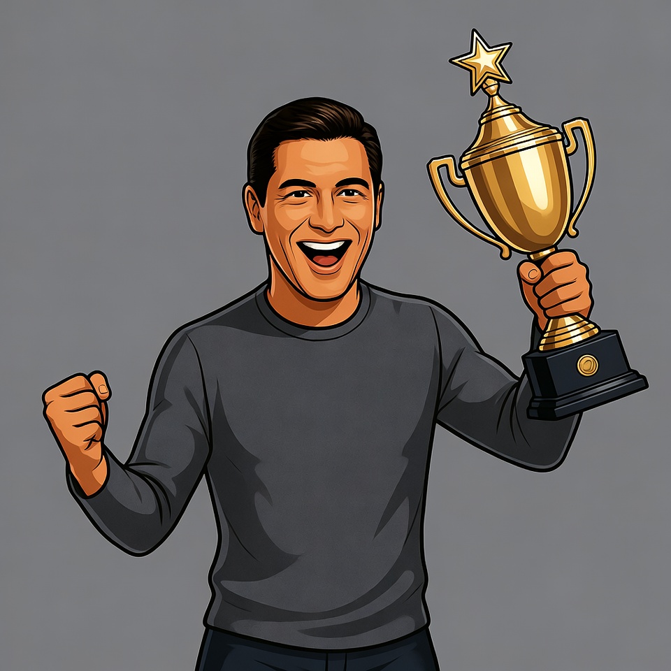 A cartoon man with short dark hair and wearing a gray sweater excitedly holds up a large golden trophy with a star on top. He smiles widely with mouth open and raises his other fist in victory. The illustration features a plain gray background.